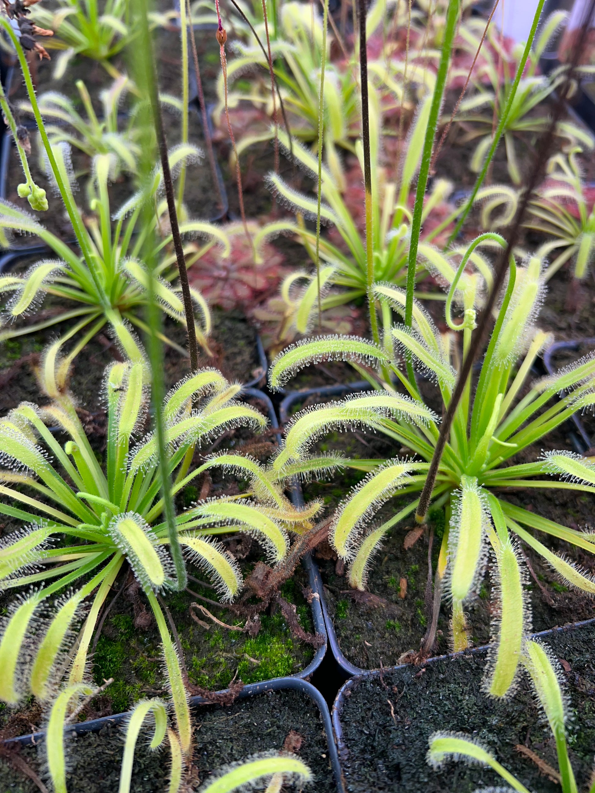Our Drosera capensis ‘Albino’ (White Flower) plants are grown from our own horticulturally produced seed. Plants shown are the exact stock for sale.