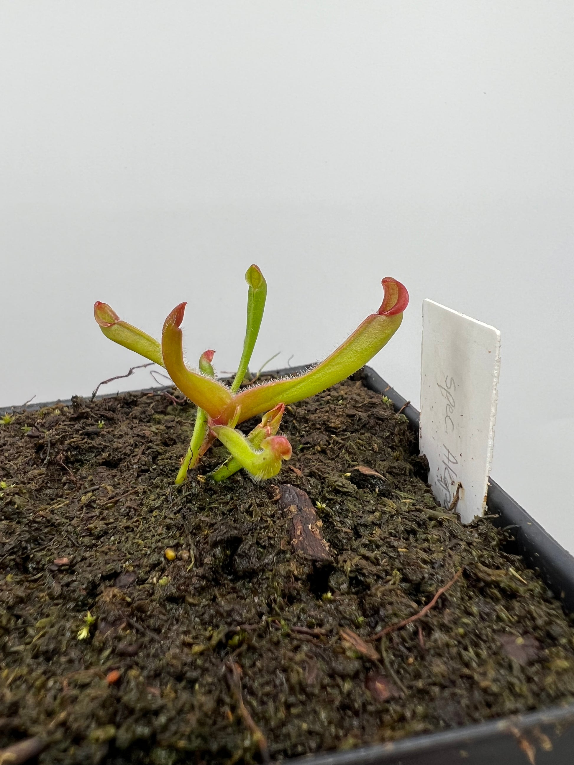 This Heliamphora spec. Akopan x (heterodoxa x ionasi) was bred and germinated from seed by us. This plant will be shipped potted as shown. (3.5” square x 5” tall pot for size reference)