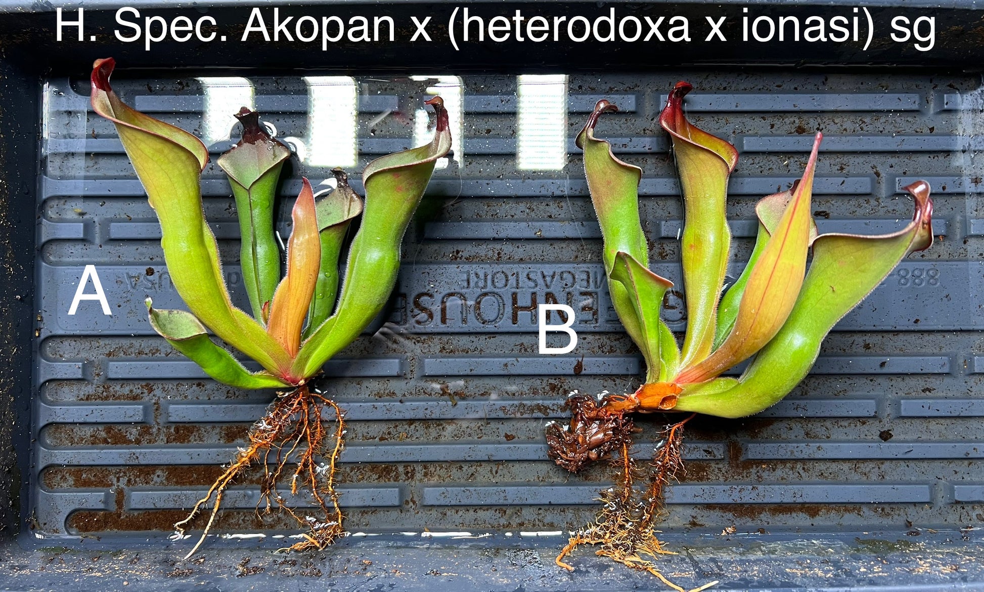 These divisions of Heliamphora Spec. Akopan x (heterodoxa x ionasi) sg LC were propagated from our own mother plant. The divisions shown are the exact divisions you will receive.