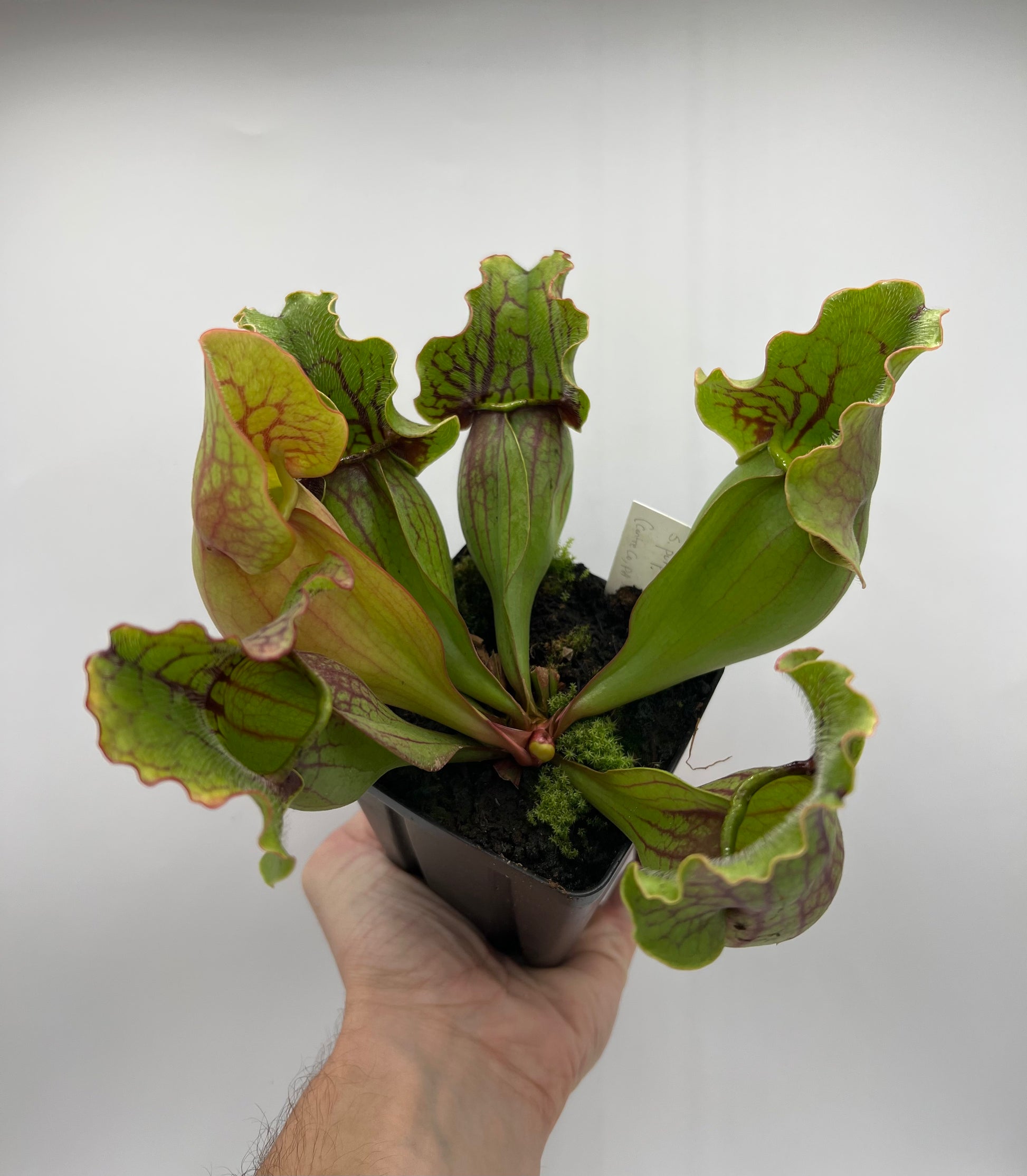 This behemoth Sarracenia purpurea ssp. purpurea (Centre Co, PA) x (Bruce Co, ON CA) was bred, germinated from seed and hand selected by us. It is a very unique individual. This plant is of flowering size. The plant shown is the exact plant you will receive.